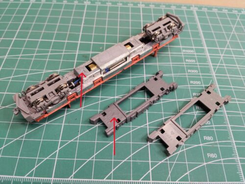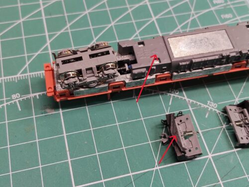 三陸鉄道のスカートを外し、300形用を取り付けます、矢印の向きを合わせて取り付けます。