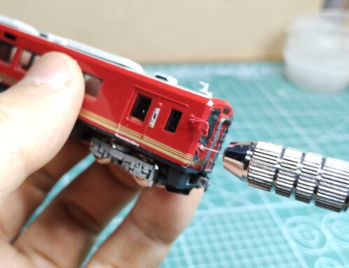 取り付け方は通常のNゲージと同じです。車体をやや広げながら取り付けます。